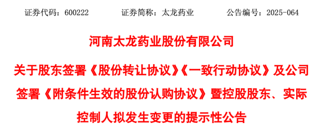 12月8日,河南太龙药业股份有限公司(以下简称“太龙药业”)发布控股股东、实际控制人拟发生变更公告。公告称,江药集团江西医药控股有限公司(以下简称“江药控股”)将成为公司新控股股东,实际控制人也将变更为江西省国有资产监督管理委员会。