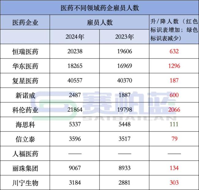 除人福医药还未公布2024年业绩外,其余9家企业均已公布,其中8家企业雇员人数增长,1家企业雇员人数下降,具体如下: