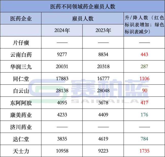 雇员人数增加超过千人的两家企业是同仁堂和天士力,分别增加1106人、1735人。