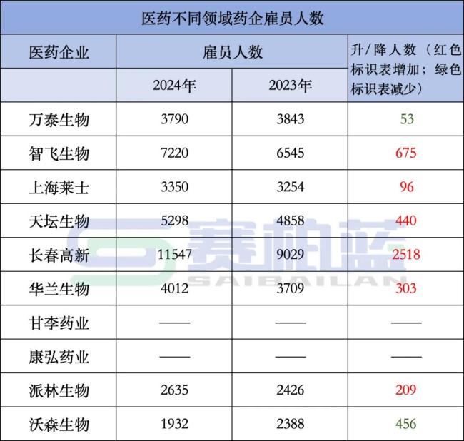 除甘李药业和康弘药业尚未公布2024年业绩外,其余8家均已发布,雇员人数增加的企业有6家,下降的企业有2家,具体如下: