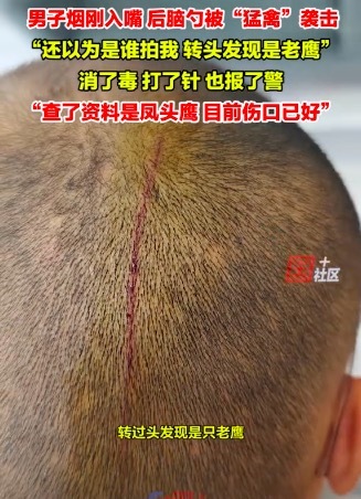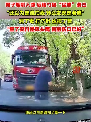 5月6日江苏苏州。男子路边抽烟,烟刚入嘴,后脑勺被“猛禽”袭击。当事人:头剧痛,已打针,并报警。