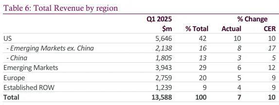 从地区分布来看,2025Q1美国市场收入56.46亿美元(+10%),中国区收入18.05亿美元(+5%),占据阿斯利康全球市场份额的13%。