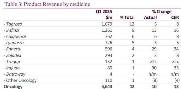 4月29日,阿斯利康公布2025Q1财报,总营收135.88亿美元(+10%),其中产品收入128.75亿美元(+9%),主要由肿瘤学和生物制药业务的双位数增长驱动。