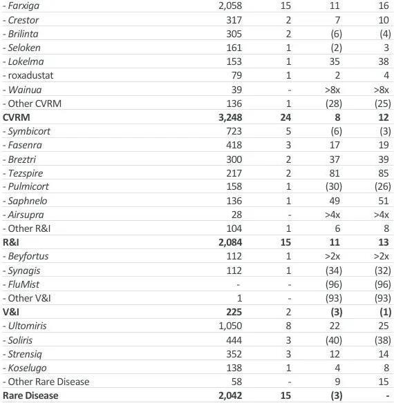 CVRM(心血管、肾脏及代谢疾病)领域,支柱产品Farxiga(达格列净)依然能打,2025Q1收入20.58亿美元(+16%)。呼吸与免疫(R&I)领域,哮喘药Tezspire(特泽利尤单抗)增长亮眼,2025Q1收入2.17亿美元(+85%)。