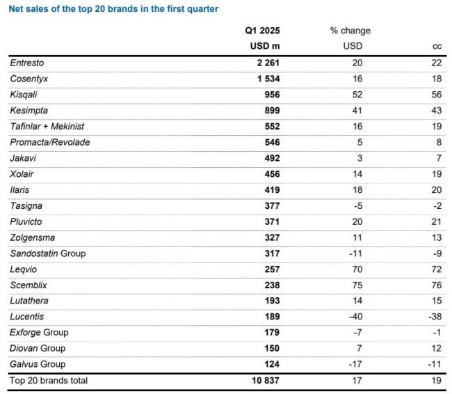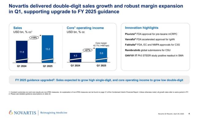 4月29日,诺华公布2025年第一季度业绩,总营收132.33亿美元,同比增长15%。其中,中国市场收入12亿美元,同比增长19%。基于这一亮眼业绩,诺华上调了全年业绩指引:销售额有望实现高个位数增长,核心营业收入有望实现低两位数增长。