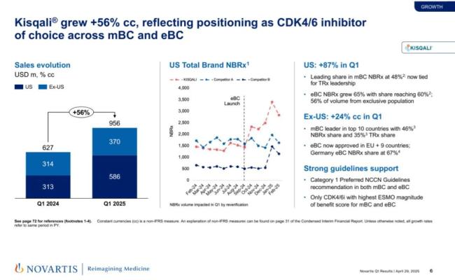 2025年Q1,Kisqali(瑞波西利)的销售额达到9.56亿美元,同比增长56%。该药在美国地区的表现尤为亮眼,同比增长87%,诺华表示这体现了该药在早期乳腺癌和转移性乳腺癌治疗中作为首选CDK4/6抑制剂的地位。