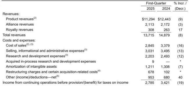 4月29日,辉瑞公布了2025年第一季度业绩,总营收137.15亿美元(-8%),其中产品收入112.94亿美元(-9%)。前三个月,辉瑞研发投入为22.03亿美元,同比下降12%。