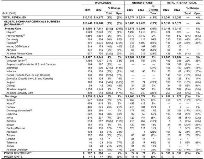 从业务单元来看来看,辉瑞肿瘤、初级护理(Primary Care)、特殊护理(Specialty Care)板块分别收入37.58亿美元(+6%)、56.96亿美元(-21%)、39.87亿美元(+4%)。