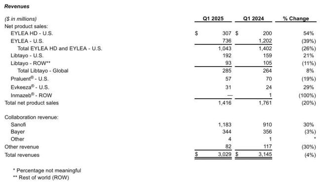 4月29日,再生元发布2025年第一季度业绩,总营收30.29亿美元,同比下降4%,其中产品销售14.16亿美元,同比下降20%。前三个月,再生元研发投入13.27亿美元,同比增长6%。