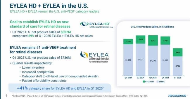 再生元的支柱产品Eylea(阿柏西普2mg)和Eylea HD(阿柏西普8mg)在前三个月的合计销售额为10.43亿美元,同比下降26%。若计入拜耳方的收入,则阿柏西普在2025Q1的全球销售额为19.01亿美元,同比下降16%。