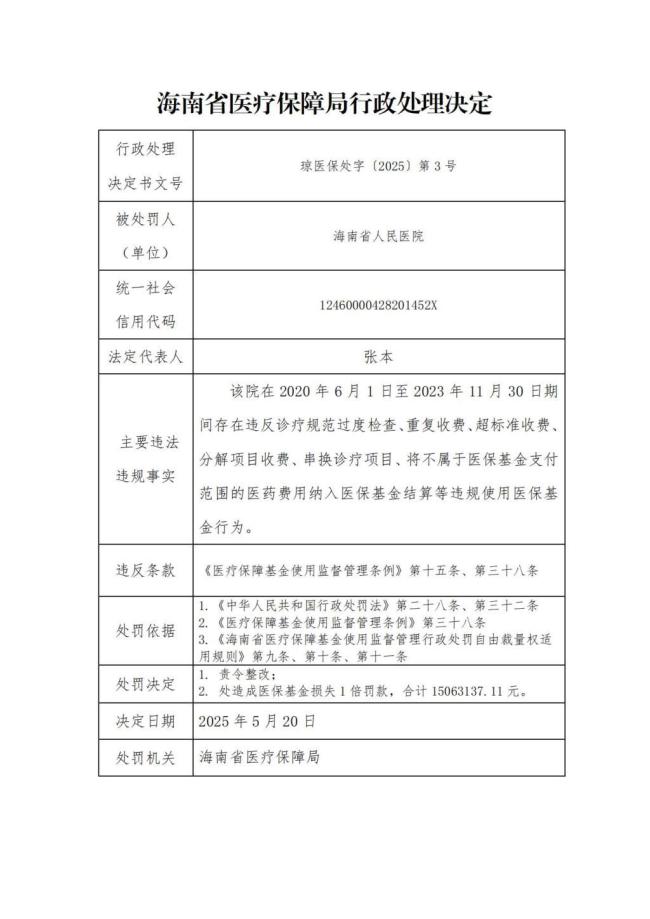 海南省医疗保障局5月26日下午公布的行政处罚决定书显示,海南省人民医院在过去三年多时间里存在违反诊疗规范过度检查、重复收费、超标准收费、分解项目收费、串换诊疗项目,以及将不属于医保基金支付范围的医药费用纳入医保基金结算等违规使用医保基金行为。因此被处以造成医保基金损失1倍的罚款,共计15063137.11元。