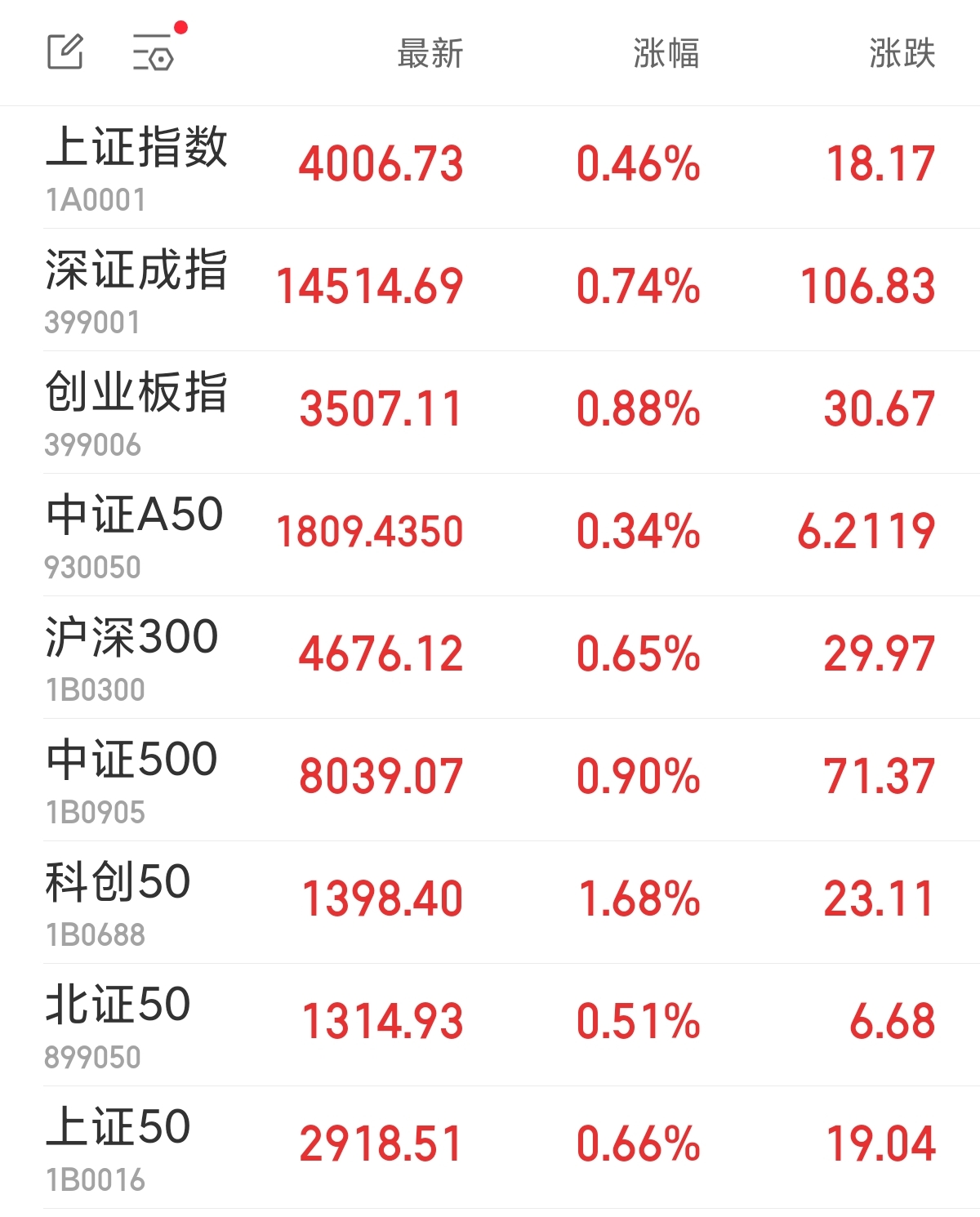 中新经纬4月14日电 周二,A股三大指数集体高开。上证指数涨0.46%,报4006.73点;深证成指涨0.74%,报14514.69点;创业板指涨0.88%,报3507.11点。