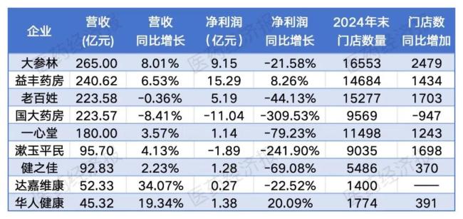 2024年,大参林实现营收265亿元,同比增长8.01%,变化原因主要系经营规模扩大,原有门店同店销售规模增加以及门店数量增长。大参林在财报中表示,通过自建、并购和直营式加盟三驾马车,其持续推进强势区域的加密以及弱势区域的突破,并不断拓展空白区域。截至2024年年底,大参林的门店数量达到16553家,同比增加2479家。