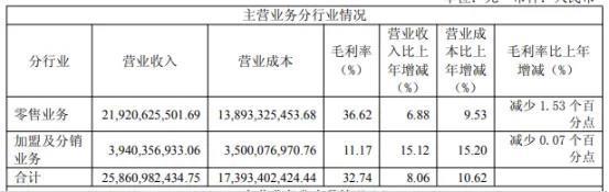 得益于不断扩大的直营门店数量以及次新店和老店的内生增长,大参林的零售业务收入达到219.21亿元,同比增长6.88%,占比84.76%;与此同时,大参林还利用直营式加盟店的特点及优势,在弱势区域迅速布局直营式加盟店,带动加盟及分销业务收入的快速增长,同比增长15.12%。大参林认为,直营式加盟不仅贡献毛利润及净利润规模,还进一步提升其销售规模,令其规模优势得以进一步加强并反哺直营零售业务。