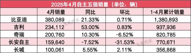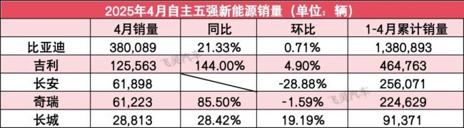 其中,比亚迪以38万+的成绩稳居第一;由于长安自主降幅显著,吉利和奇瑞反超长安自主分别位列第二、第三;长安自主下滑至第四位;而长城在五家中依旧垫底。不过好消息是,4月份长城重回了10万辆。