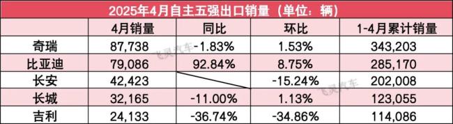 其余三家则依旧在2万-4万辆的水平徘徊。其中,4月份,长安(含合营企业)出口量为42,423辆,环比下降绌5.24%;今年1-4月,长安累计出口量为202,008辆。长城汽车4月出口量为32,165辆,同比下降11%,环比增长1.13%;今年1-4月,长城累计出口量为123,055辆。吉利4月出口量为24,133辆,同比下滑36.74%,环比下滑34.86%;今年1-4月累计销量为114,086辆。