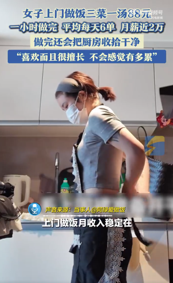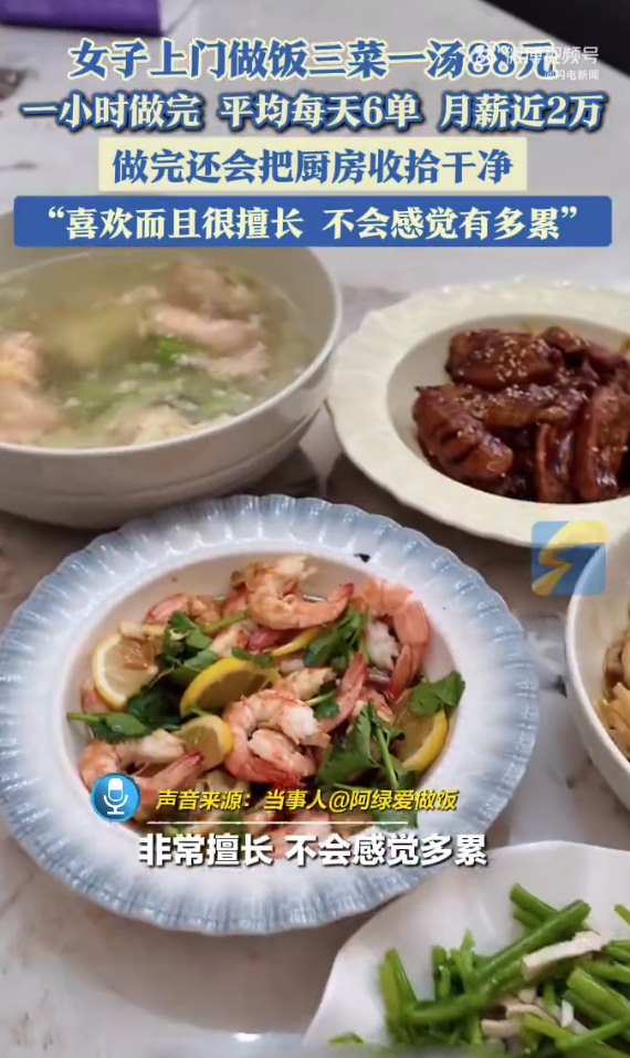 5月7日浙江杭州,女子从事上门做饭的工作,三菜一汤收费88元,平均每天能接6单,月薪近2万。