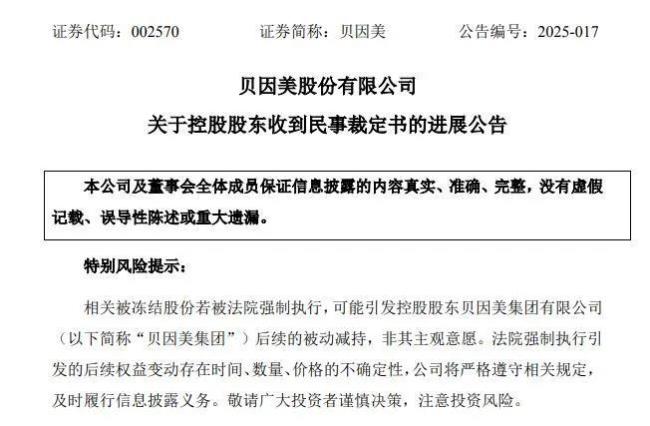 贝因美表示,相关被冻结股份若被法院强制执行,可能引发贝因美集团的后续被动减持,非主观意愿的行为。