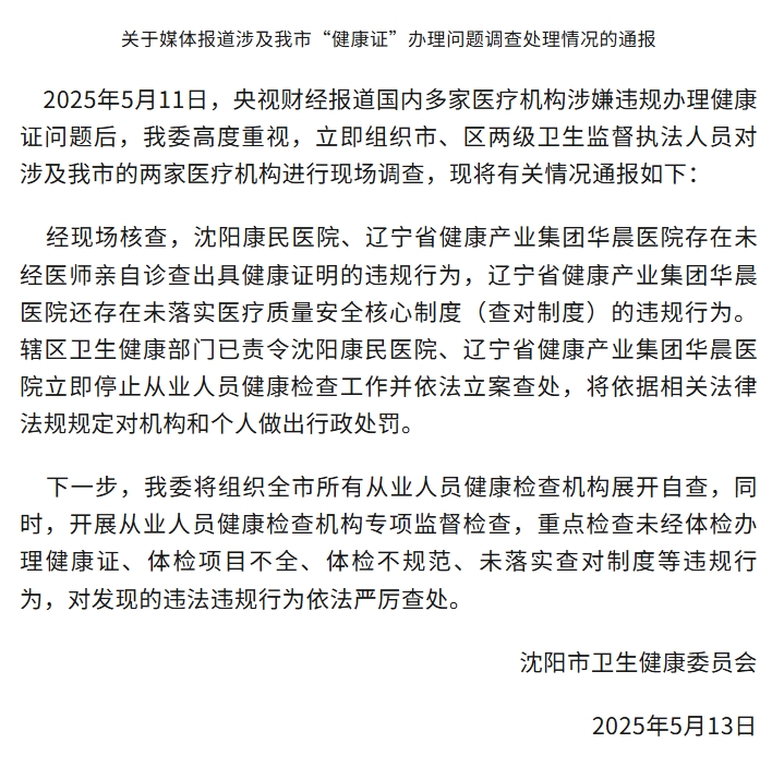 经现场核查,沈阳康民医院、辽宁省健康产业集团华晨医院存在未经医师亲自诊查出具健康证明的违规行为,辽宁省健康产业集团华晨医院还存在未落实医疗质量安全核心制度(查对制度)的违规行为。辖区卫生健康部门已责令沈阳康民医院、辽宁省健康产业集团华晨医院立即停止从业人员健康检查工作并依法立案查处,将依据相关法律法规规定对机构和个人做出行政处罚。