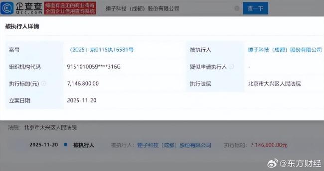 11月25日,企查查APP显示锤子科技(成都)股份有限公司新增一条被执行人信息,执行标的约715万元,执行法院为北京市大兴区人民法院。该公司成立于2012年5月,法定代表人为管志良,注册资本约3150万元,经营范围包括计算机软硬件技术开发、技术服务及手机生产等,由罗永浩和成都东方广益投资有限公司等共同持股。