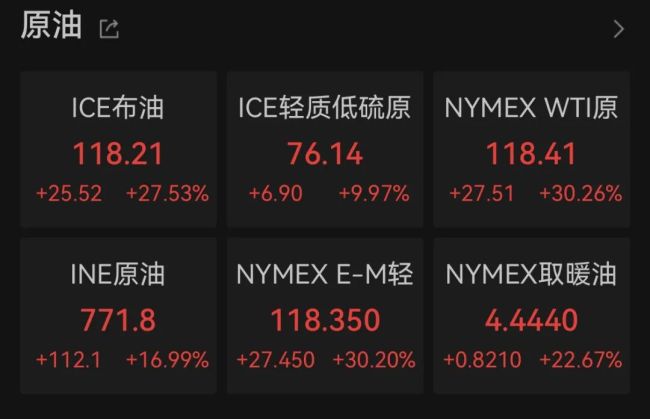 受中东战争动荡影响,今日WTI原油期货暴涨超30%,截至发稿,报118.41美元/桶,为2022年6月以来新高,布伦特原油期货价格涨幅扩大至27%。