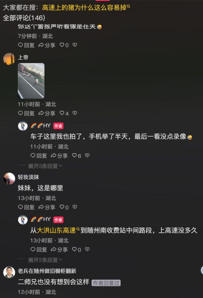 视频中,这些猪一点也不认生,下车后就开始四处溜达,有的闻闻这,拱拱那,悠哉游哉地散步,仿佛在逛自家后院。高速路上车来车往,那些猪大摇大摆走在路中间,后面的小车狂按喇叭减速,司机看得目瞪口呆。有一头猪冲到对面车道,差点被一辆白色SUV撞上,SUV紧急打方向盘才避免了事故。