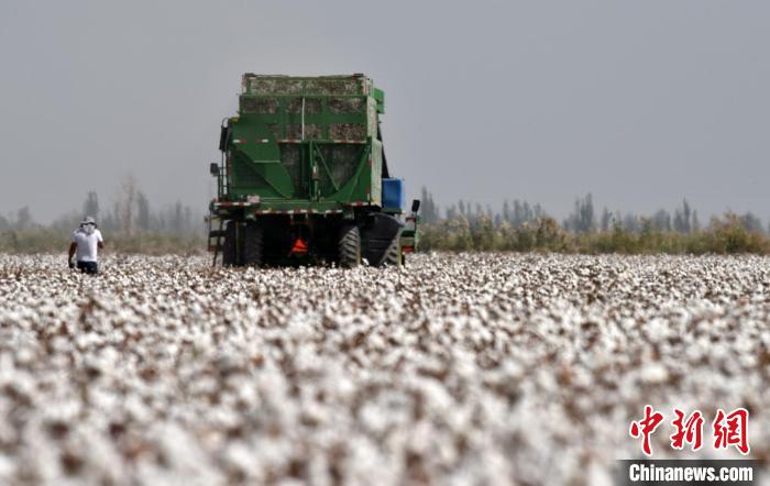 棉花成熟期间,大型采棉机在田间作业。(资料图)确·胡热 摄