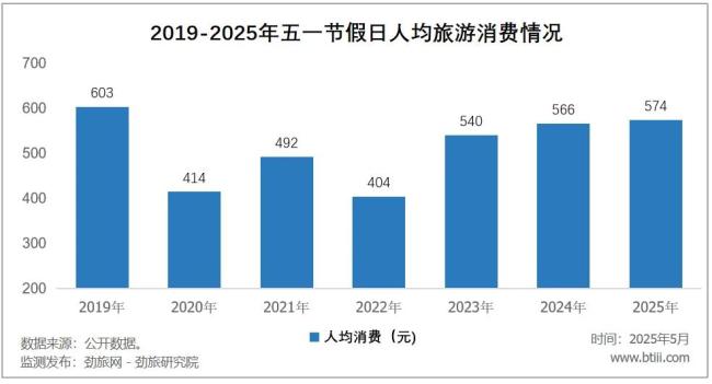 官方统计数据显示,今年五一国内旅游人均消费为574元,依然低于2019年的603元,为疫情前的95.19%,至今未全面超越。