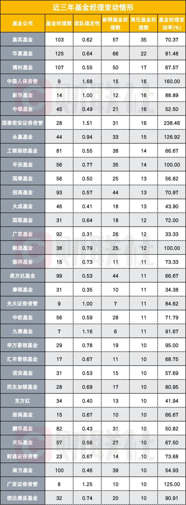 从近三年的数据来看,包括基金公司在内的资管公司基金经理变动率已超出100%。以人保资产为例,近三年新聘了15位基金经理,同时有16位基金经理离任,目前基金经理数量仅为9人。新华基金近三年新聘了12位基金经理,16位基金经理离任。永赢基金近三年新聘的基金经理数量达33位,同时有15位基金经理离任。