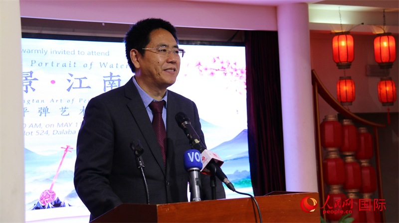 中国驻尼日利亚使馆负责文化事务的参赞兼尼日利亚中国文化中心主任杨建兴致辞。人民网记者 姜宣摄