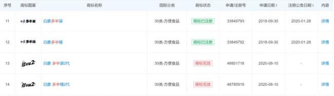 梳理发现,“多半”、“白象多半”、“白象多半袋”以及“白象多半桶”等,均为公司注册的商标。