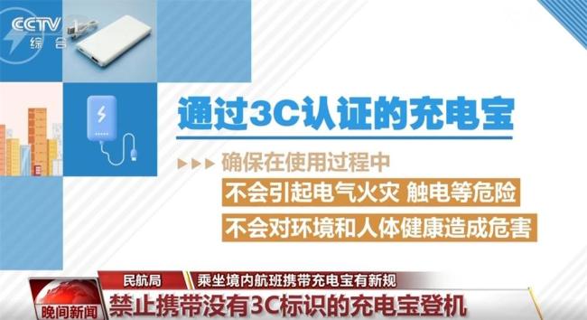 自6月28日起,民航局禁止旅客携带没有3C标识、3C标识不清晰或被召回型号及批次的充电宝乘坐境内航班。有3C标识的充电宝意味着产品通过了中国强制性产品认证,其电气安全、电池安全和环保标准均符合国家规定,确保使用过程中不会引起电气火灾、触电等危险,也不会对环境和人体健康造成危害。