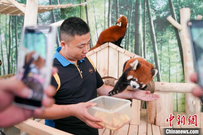 图为游客与小熊猫互动。中新社记者 赵宇航 摄