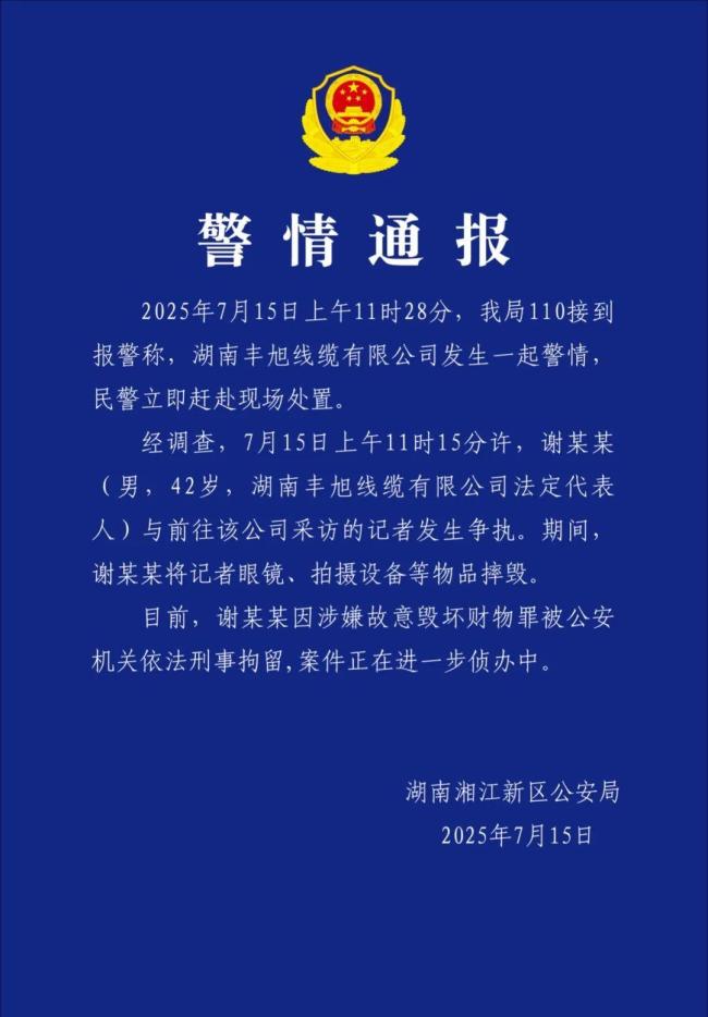 7月15日,晨意帮忙记者前往湖南丰旭线缆有限公司采访。公司谢姓负责人在接受采访时称,他们所有的产品都是合格的,并表示可以走法律程序解决争议。然而,在回应过程中,该负责人突然冲出,砸碎了电视台记者的摄像机,并推搡记者,试图抢夺记者手机。