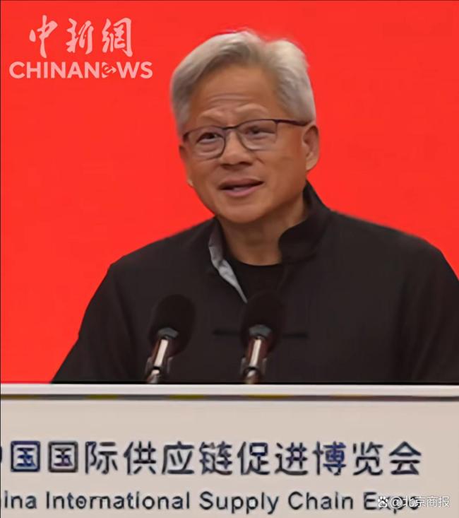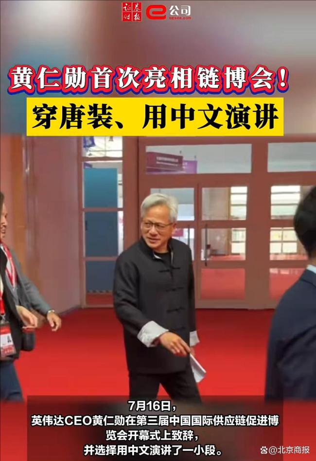 黄仁勋在第三届链博会开幕式上致辞,这是他首次参加链博会。他身穿唐装,用中文发表了一小段演讲,并表示自己感到很紧张。黄仁勋提到,很高兴来到中国,链博会的规模非常大,气氛热烈,体现了中国对创新的支持。