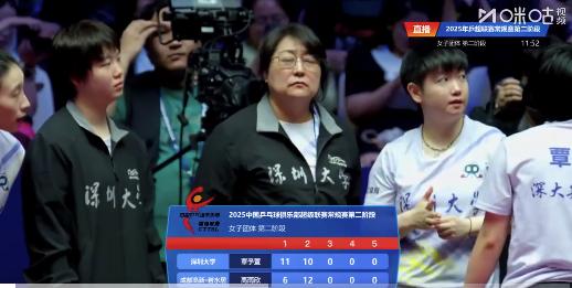 2025赛季乒超联赛常规赛第二阶段,深圳大学vs成都高新若水居,咪咕解说@周冠达-D:深圳大学场外是孙颖莎指导、张成指导和高指导。