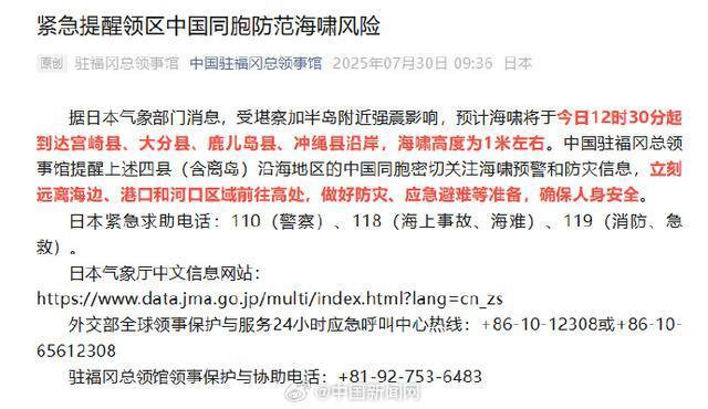 中国驻福冈总领事馆提醒宫崎县、大分县、鹿儿岛县、冲绳县沿海地区的中国同胞密切关注海啸预警和防灾信息,立刻远离海边、港口和河口区域前往高处,确保人身安全。据预测,海啸将于当日12时30分起到达这些地区,海啸高度为1米左右。