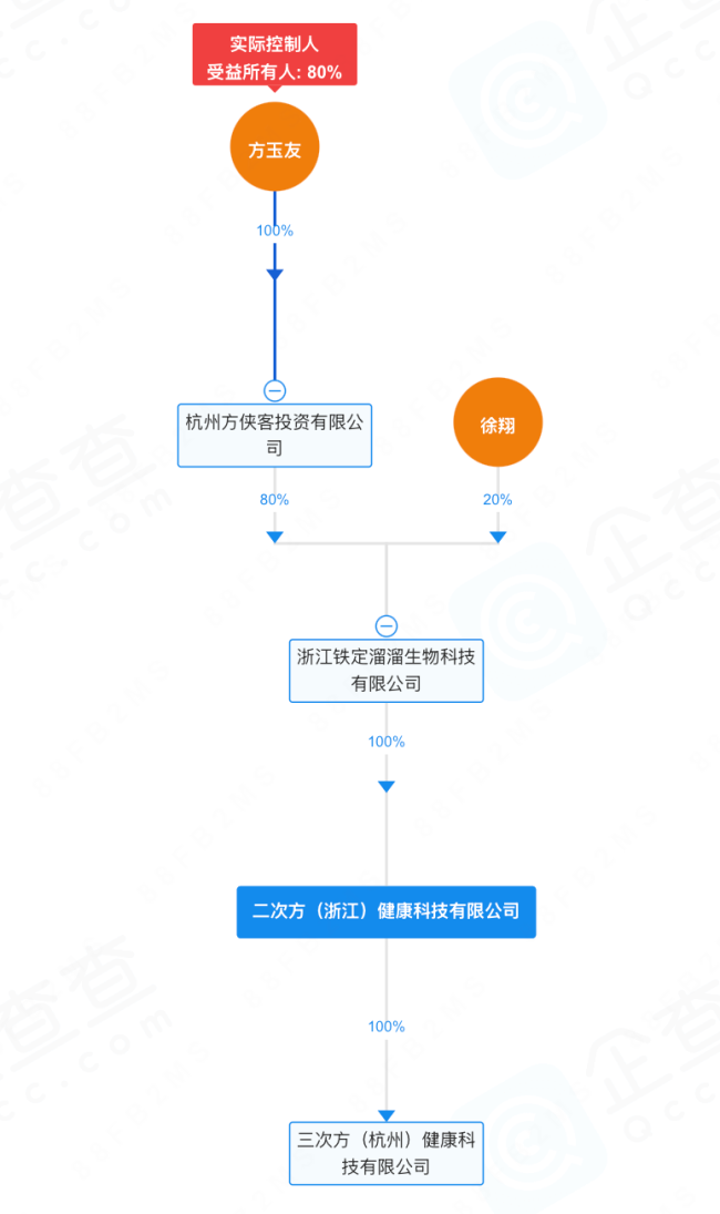 不过,方玉友进军饮品行业,创立“二次方”品牌,是去年9月从珀莱雅辞任董事、总经理职务之后。去年4月,二次方(浙江)健康科技有限公司(下称“二次方”)正式成立,由浙江铁定溜溜生物科技有限公司全资持股。企查查显示,杭州方侠客投资有限公司持有后者80%股份,方玉友正是方侠客投资的控制人。