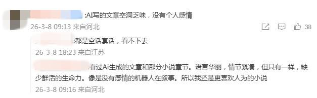有报道称,社交媒体上的AI写作暴富噱头,让网文圈变了天。有网文作家坦言,自己日更近万字已是极限,但在AI几分钟几万字面前,直接被降维打击。评论区里,网友议论纷纷,“AI写的文章空洞乏味,没有个人感情”“有一本AI文火的吗”……