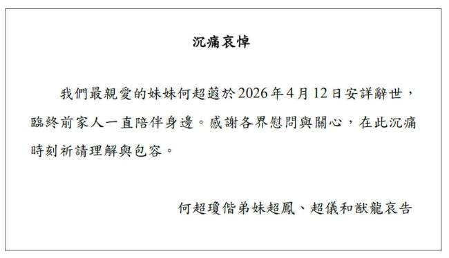 4月12日,“赌王”何鸿燊的女儿、信德集团执行董事何超蕸逝世,享年60岁。信德集团当日发布哀悼声明,并附上家人通告:“我们最亲爱的妹妹何超蕸于2026年4月12日安详辞世,临终前家人一直陪伴身边。感谢各界慰问与关心,在此沉痛时刻祈请理解与包容。”