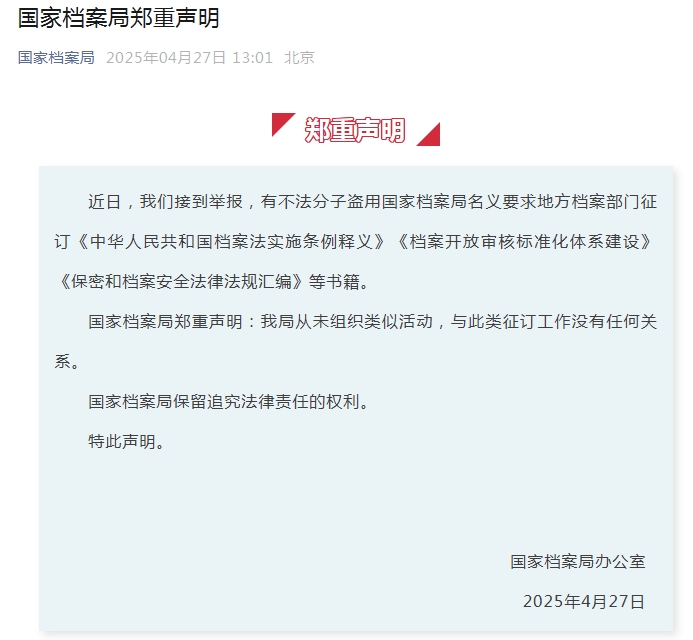 中新网4月27日电 据国家档案局微信公众号消息,国家档案局办公室27日发布声明称,近日,国家档案局接到举报,有不法分子盗用国家档案局名义要求地方档案部门征订《中华人民共和国档案法实施条例释义》《档案开放审核标准化体系建设》《保密和档案安全法律法规汇编》等书籍。
