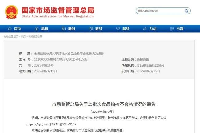 7月25日,国家市场监管总局关于35批次食品抽检不合格情况的通告显示,近期,市场监管总局组织食品安全监督抽检1782批次样品,检出35批次样品不合格。