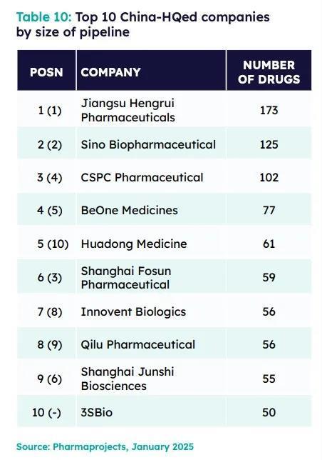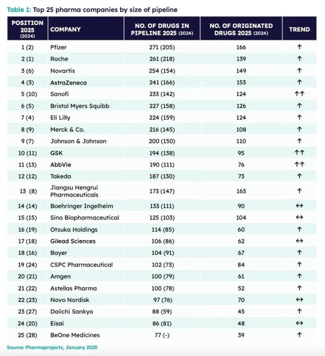 其中,恒瑞众望所归,虽然排名上从第8位滑落到第13位,但仍是榜单中排名最靠前的中国药企,其自研管线数量也猛增30项,在全球仅次于辉瑞;另外,中生制药仍保持原有位次,石药集团由第24名跃升至第19名,百济神州也成为了榜单新客。遗憾的是,复星今年并未进入TOP25阵营。
