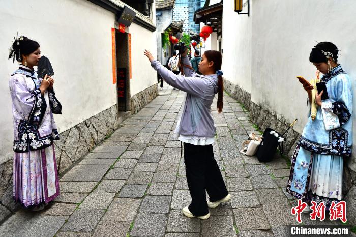 图为5月4日,跟拍摄影师在福州三坊七巷为游客拍摄“三条簪”妆造。中新社记者 张斌 摄