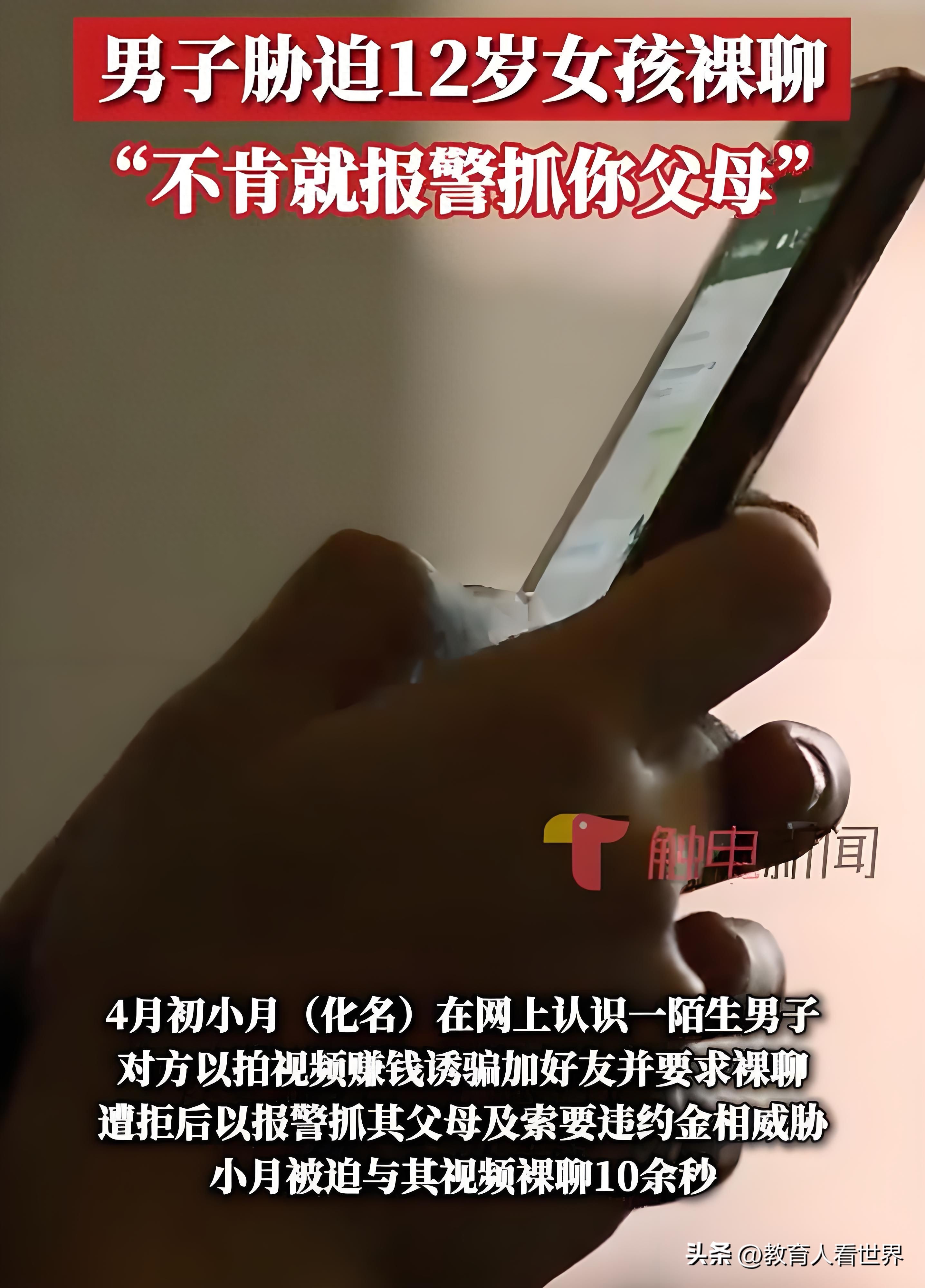 男子胁迫12岁女孩裸聊:不肯就报警抓你父母,已被刑拘!5月7日,广东触电新闻报道了一个新闻。湖北通城的12岁女孩小月,被网上结识的一名男子以拍视频赚钱引诱,要求裸聊,被拒绝后,以索要违约金和报警抓其父母威胁,小月被迫留下10余秒视频。据通城公安通报,4月29日,警方在广东汕头抓获犯罪嫌疑人熊某,该案正是利用“威胁父母”话术实施的隔空猥亵。该事件引发网友愤怒,纷纷呼吁严惩。
