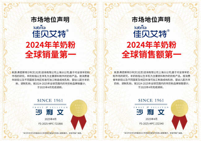 近日,澳优旗下佳贝艾特“领头羊”市场地位再获双料认证!国际权威调研公司弗若斯特沙利文(Frost&Sullivan)经市场研究确认:2024年佳贝艾特羊奶粉销量与销售额全球第一。全球领先的消费者研究与零售监测公司尼尔森IQ(NielsenIQ)数据也显示:2024年佳贝艾特在中国进口婴幼童羊奶粉市场销售量份额及销售额份额均高达84%。据此,佳贝艾特已连续7年在中国进口婴幼童羊奶粉市场份额超6成,“领头羊”地位持续稳固。