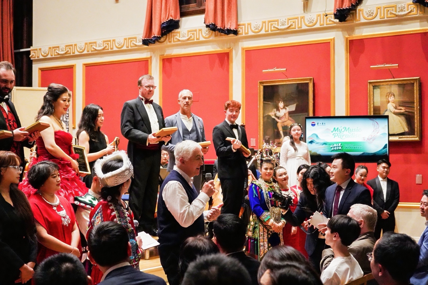 值得一提的是,由中欧音乐家共同演绎的《贵州回忆》,凭借优美旋律与跨文化创新表达,赢得现场观众喜爱,掌声经久不息。该作品是前往贵州采风意大利作曲家安德烈亚的原创,灵感源于贵州山水人文,融入侗族大歌、苗银碰撞声等,满含贵州风情,他感慨道:“作品兼具东方特色与西方音乐逻辑,碰撞出优美的跨国音乐火花。”现场,安德烈亚还展示了从贵州带回的苗族银饰与蝉鸣模拟道具。