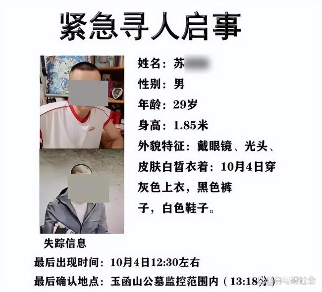苏阳阳虽然已经29岁,但一直未婚。他在一家国企工作,拥有211本科学历和1米85的身高,在外人看来条件优越。国庆假期期间,由于连续阴雨天气,苏阳阳一直在家。直到10月4日下午,他决定出门散心,进入玉函山公墓后便失去了联系。