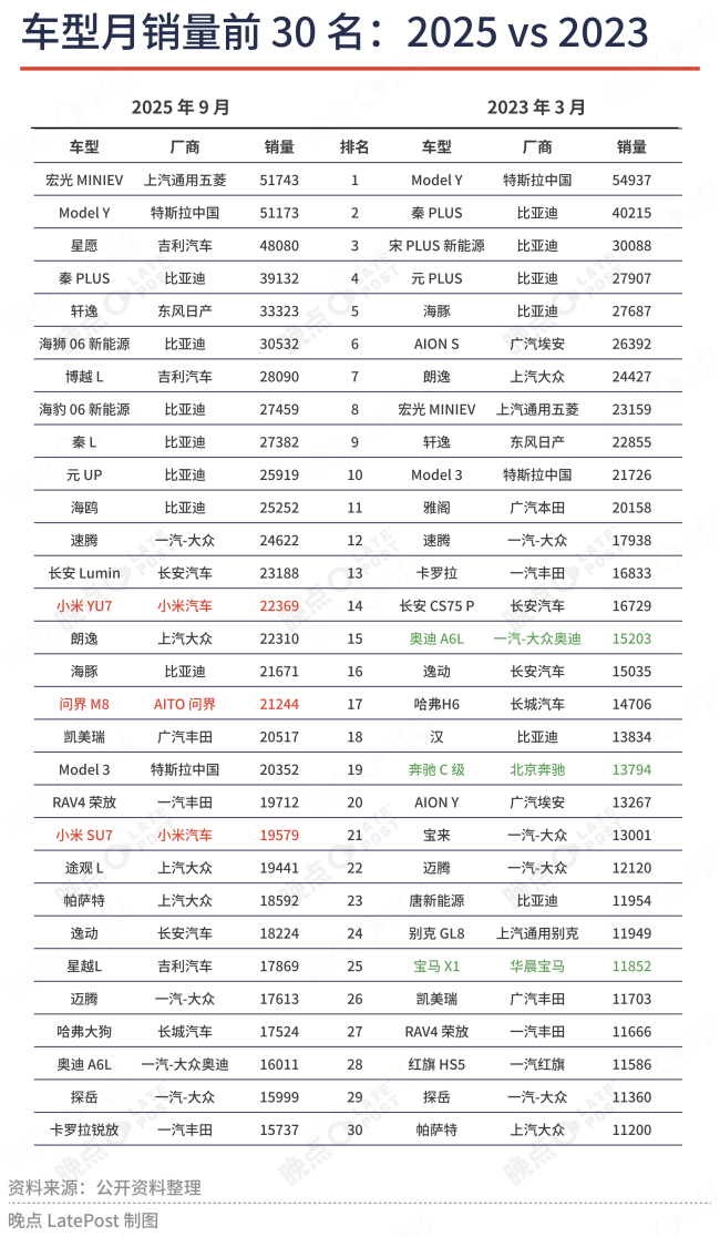 通过对比2023年3月和2025年9月品牌销量排名的前三十可以发现,2023年的四家豪华品牌只剩下三家上榜,并且无一进入前十名。另一方面,零跑已经摸到了前十名的门槛,而只有两款车的小米竟然也挤进了前二十名。最令人堪忧的,要数广汽,广汽本田、广汽传祺和广汽埃安已经跌倒了三十名的底部,只剩下广汽丰田在苦苦支撑。