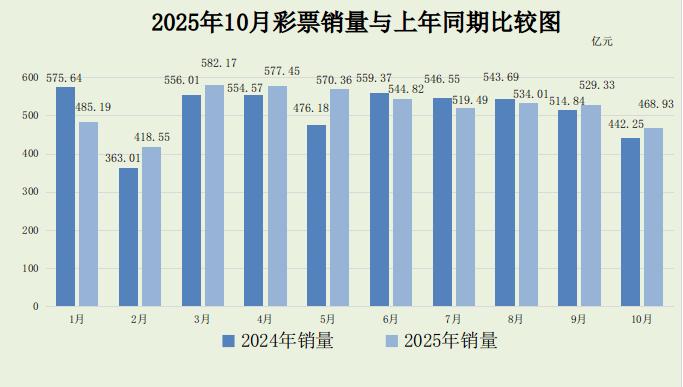 中新网11月24日电 据财政部网站消息,财政部24日在其官网公布2025年10月份全国彩票销售情况。10月份,全国共销售彩票468.93亿元,同比增加26.68亿元,增长6.0%。1-10月累计,全国共销售彩票5230.30亿元,同比增加98.19亿元,增长1.9%。